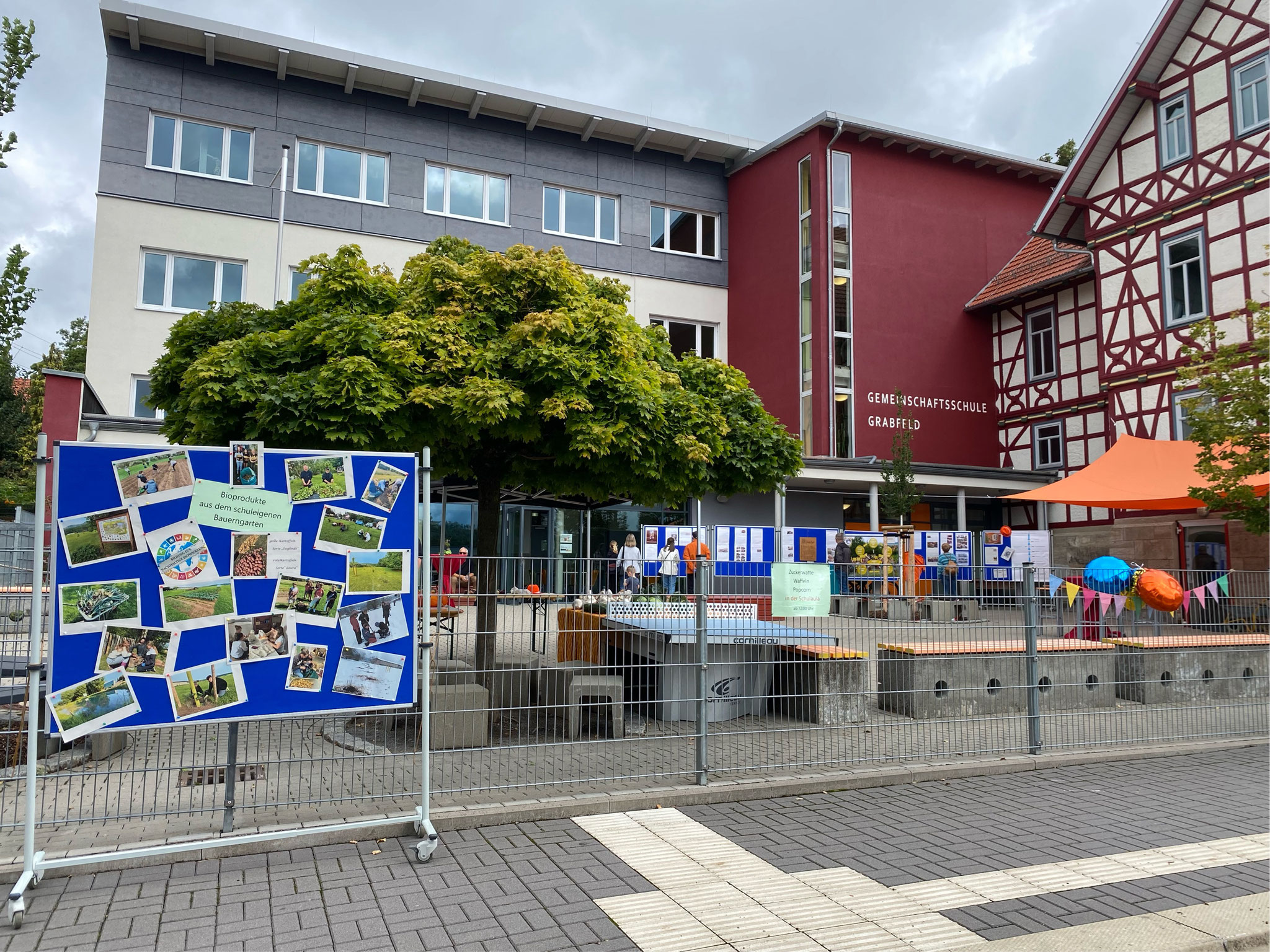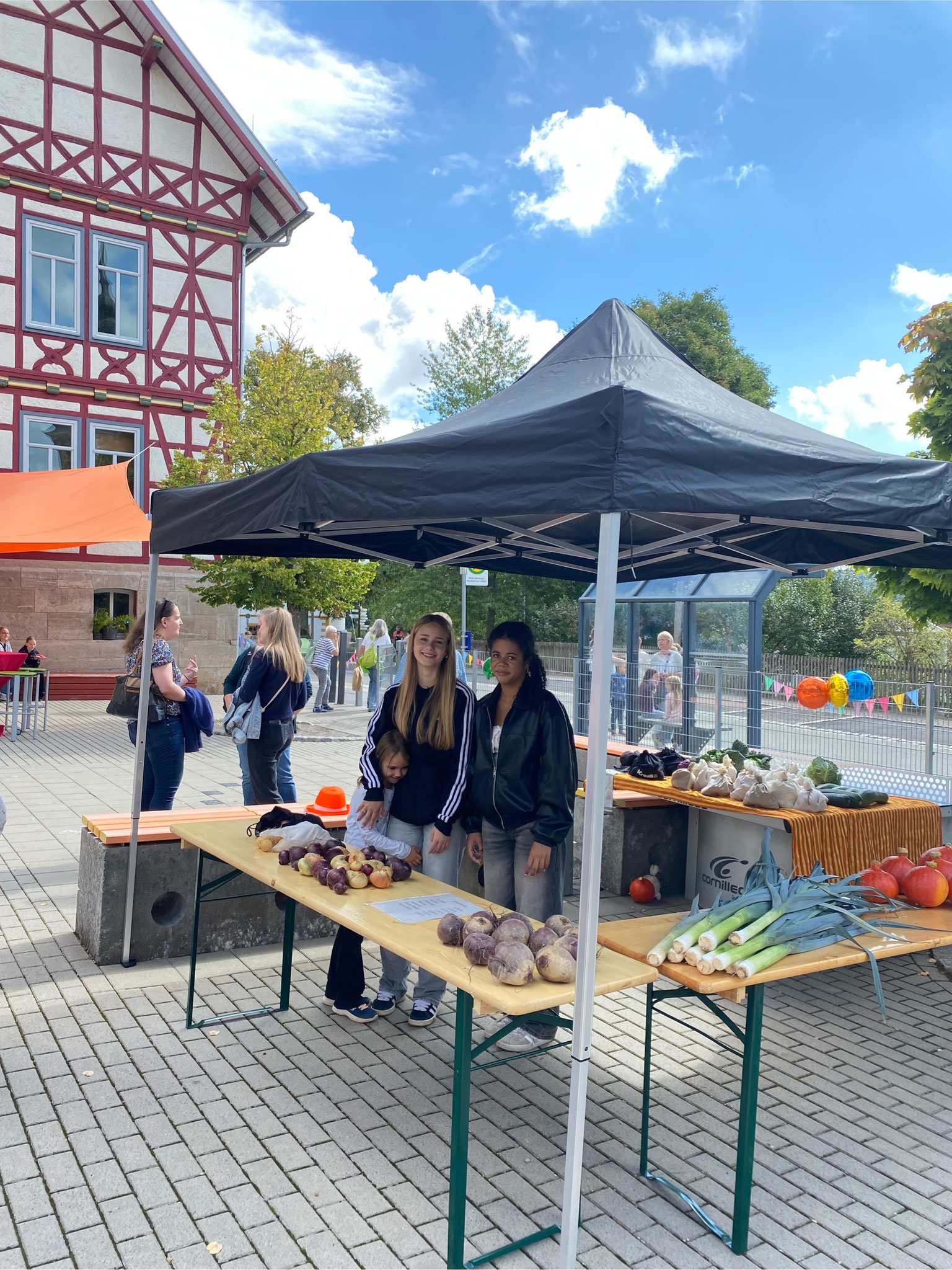 Anlässlich der 1200- Jahrfeier in Bibra öffnete auch die Schule ihre beiden Höfe, um einen Beitrag zum Festwochenende in Bibra zu leisten. Auf dem vorderen Hof verkaufte die Klasse 6b Zuckerwatte. Popcorn, Waffeln und Getränke. Am Stand des Projektunterrichtes konnten Bio-Produkte aus unserem Bauerngarten erstanden werden: Wirsing, Lauch, Zwiebeln, gelbe und rote Kartoffeln, Kürbisse. Die Ausstellung zur Schulgeschichte ergänzte das Angebot.